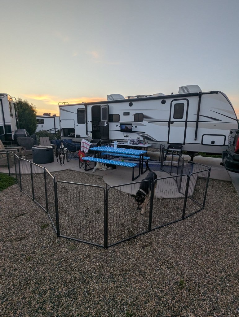 This newer campground offered tons of amenities, including a playground, pool, hot tubs, arcade, full bar, quick-service restaurant, and spacious sites with propane fire pits and chairs. We chose a corner lot, to give us a little more space, close to both dog parks. We spent our first full day at the campground enjoying the pool and riding our bikes around.